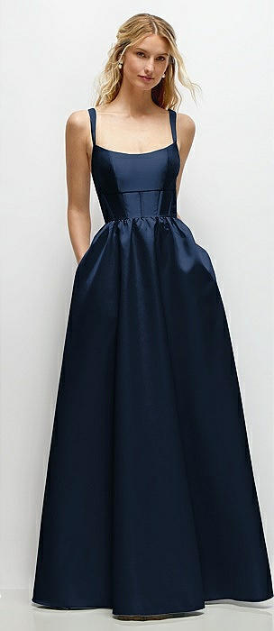 Scoop Neck Inset Corset Satin Maxi Dress with Pockets in midnight navy