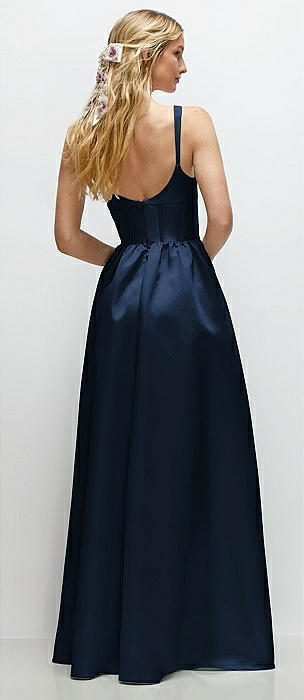 Strapless Topstitched Corset Satin Maxi Dress with Draped Column Skirt in midnight navy
