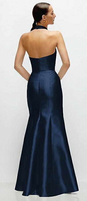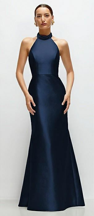 High-Neck Halter Open-Back Satin Trumpet Dress in midnight navy