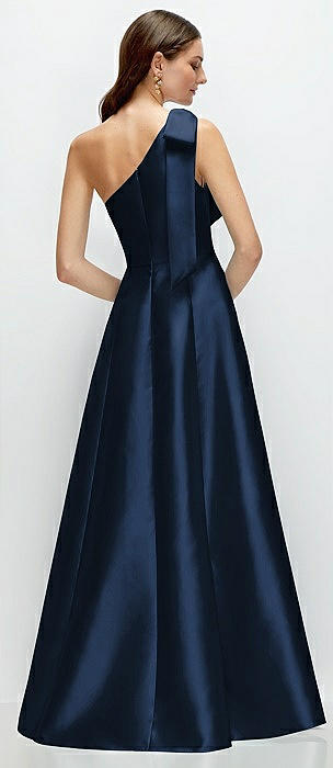 Bow One-Shoulder Full A-Line Satin Maxi Dress in midnight navy