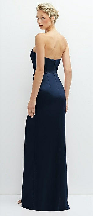 Strapless Topstitched Corset Satin Maxi Dress with Draped Column Skirt in midnight navy