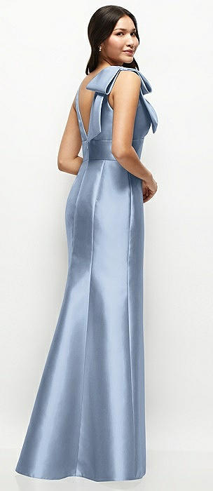 Deep V-back Satin Trumpet Dress with Cascading Bow at One Shoulder in cloudy