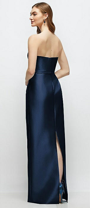 Strapless Satin Column Dress with Bow-Trimmed Skinny Belt in midnight navy
