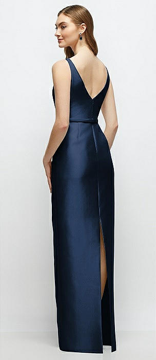 Bateau Neck Satin Column Dress with Bow-Trimmed Skinny Belt in midnight navy