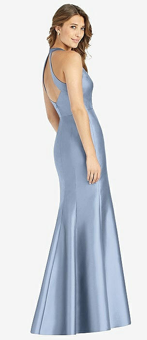 High-Neck Halter Open-Back Satin Trumpet Dress in midnight navy
