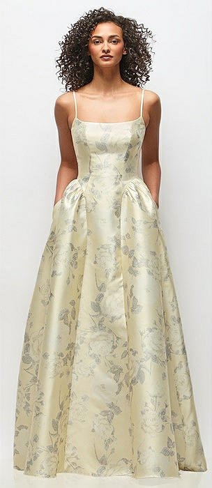 Scoop Neck Drop Basque Skirt Floral Satin Maxi Dress with Pockets in butter yellow floral