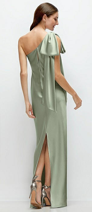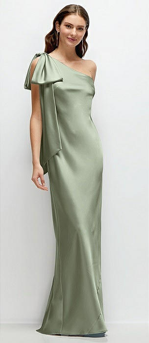 One-Shoulder Bias-Cut Satin Maxi Dress with Cascading Shoulder Bow in sage