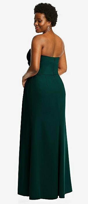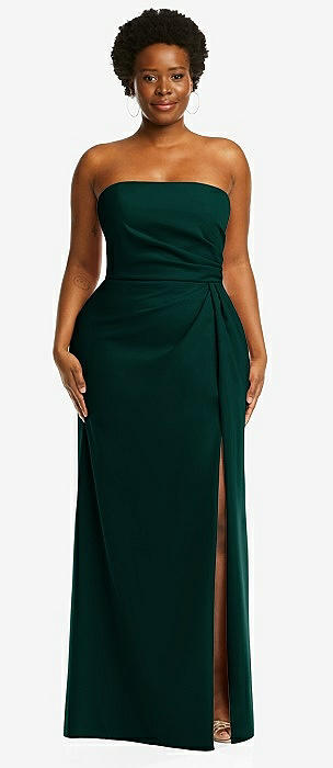 Strapless Pleated Faux Wrap Trumpet Gown with Front Slit in evergreen