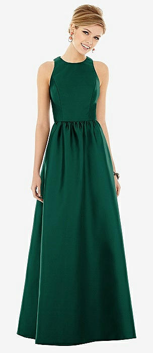 Shirred Skirt Jewel Neck Halter Dress with Front Slit in hunter green