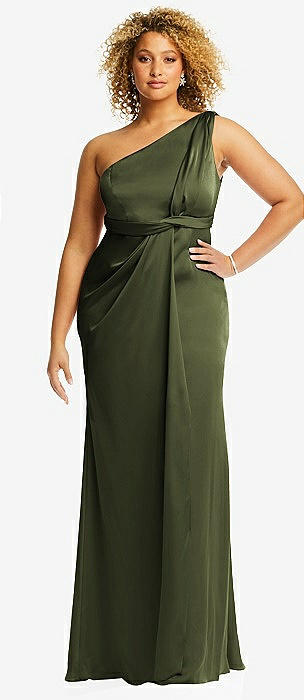 One-Shoulder Draped Twist Empire Waist Trumpet Gown in olive green