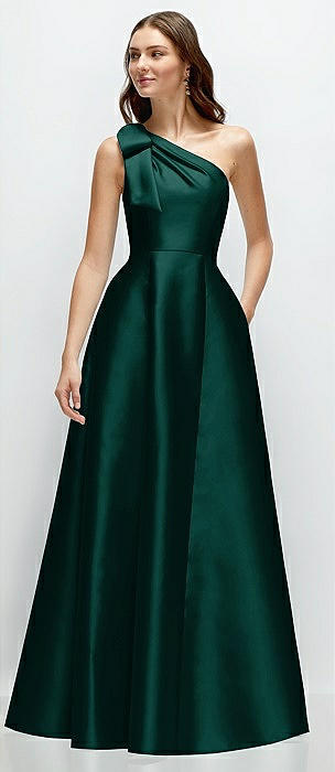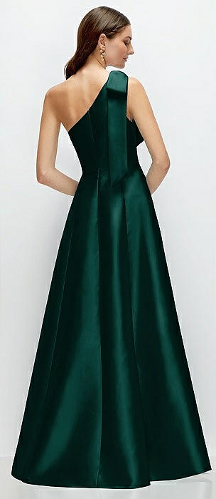 Bow One-Shoulder Full A-Line Satin Maxi Dress in evergreen