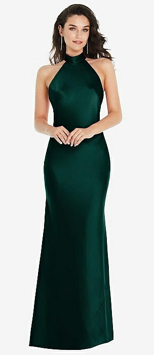 Draped Twist Halter Tie-Back Trumpet Gown in evergreen