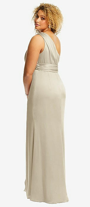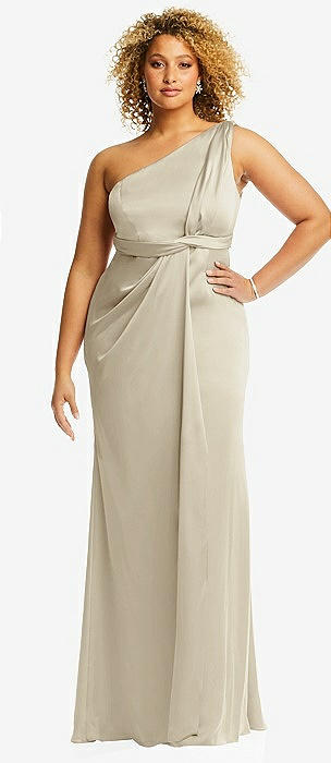 One-Shoulder Draped Twist Empire Waist Trumpet Gown in champagne