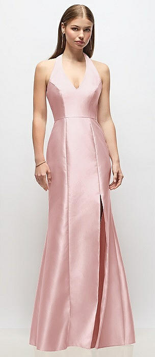 V-Neck Halter Satin Trumpet Gown in ballet pink