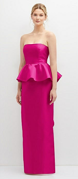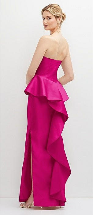 Strapless Satin Maxi Dress with Cascade Ruffle Peplum Detail in think pink