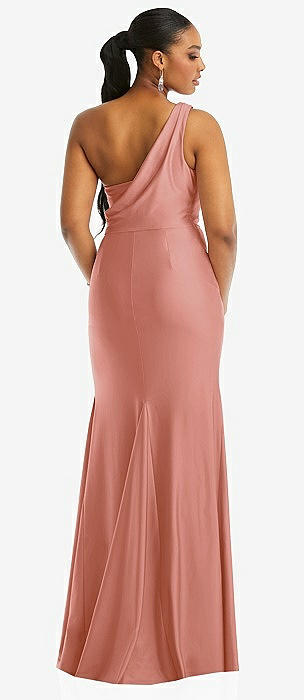 One-Shoulder Draped Twist Empire Waist Trumpet Gown in desert rose