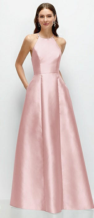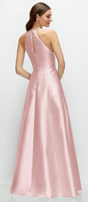 Jewel Neck Halter Full A-Line Satin Maxi Dress in ballet pink