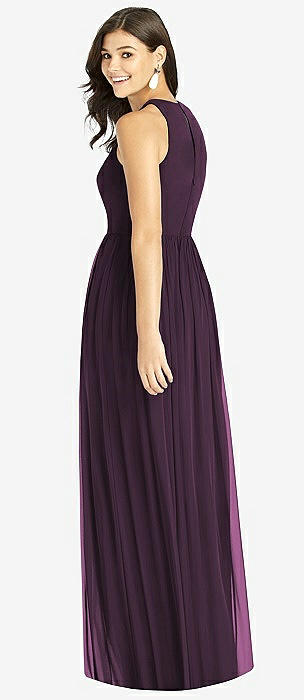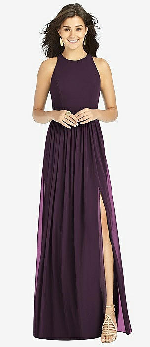Shirred Skirt Jewel Neck Halter Dress with Front Slit in aubergine