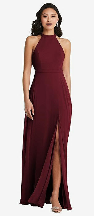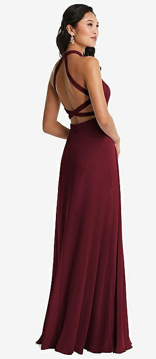 Stand Collar Halter Maxi Dress with Criss Cross Open-Back in cabernet
