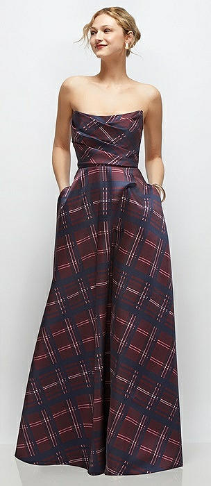 Strapless Draped Tartan Cat-Eye Satin Maxi Dress with Full Skirt in cabernet midnight tartan
