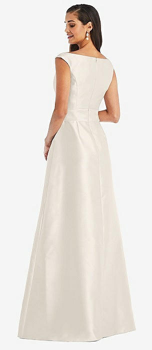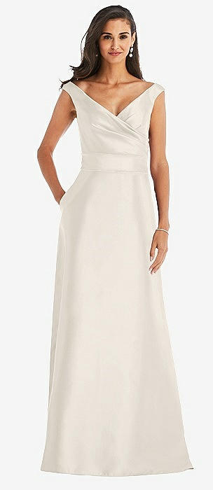 Off-the-Shoulder Draped Wrap Satin Maxi Dress in ivory