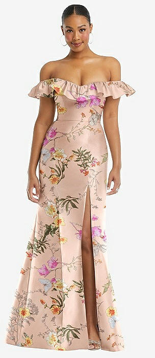 Off-the-Shoulder Ruffle Neck Floral Satin Trumpet Gown in butterfly botanica pink sand
