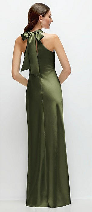 Pleated Halter Bias Satin Maxi Dress with Self-Tie Bow Back in olive green