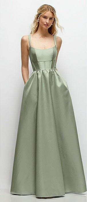 Scoop Neck Inset Corset Satin Maxi Dress with Pockets in sage