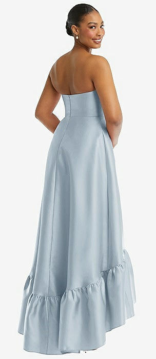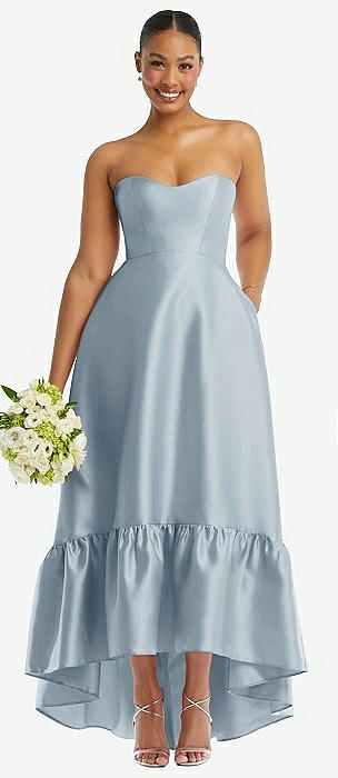 Strapless Deep Ruffle Hem Satin High Low Dress with Pockets in mist