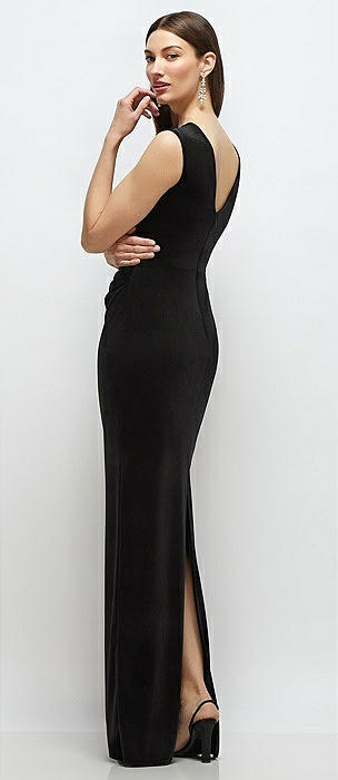 High-Neck Cap Shoulder Pleated Bodice Velvet Column Maxi Dress in black