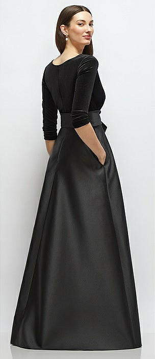 3/4 Sleeve Wrap Bodice Full Skirt Black Velvet and Satin Dress with Sash in black
