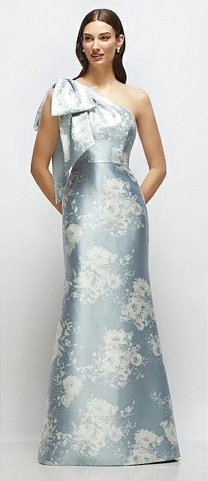 Bow One-Shoulder Satin Floral Maxi Dress with Trumpet Skirt in porcelain blue seraphina floral