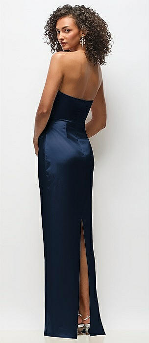 Strapless Draped Bodice Stretch Satin Column Maxi Dress in midnight navy