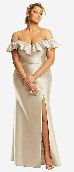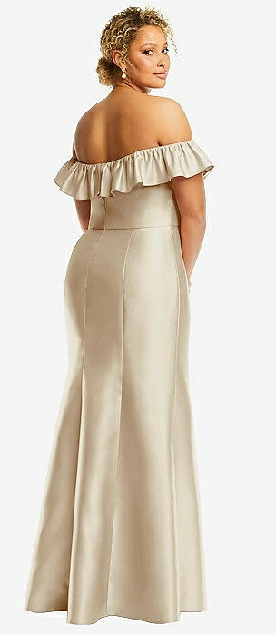 Off-the-Shoulder Ruffle Neck Satin Trumpet Gown in champagne