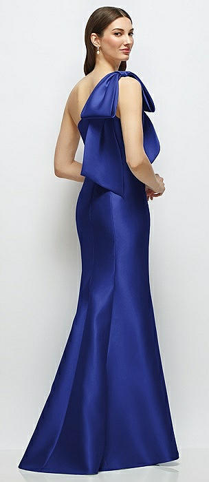 Bow One-Shoulder Satin Maxi Dress with Trumpet Skirt in cobalt blue