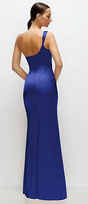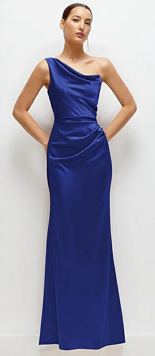 One-Shoulder Cat-Eye Neckline Fit and Flare Satin Maxi Dress in cobalt blue