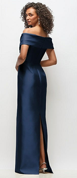 Draped Wrap Off-the-Shoulder Satin Column Floral Maxi Dress in midnight navy