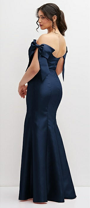 Off-the-Shoulder Bow Satin Corset Dress with Fit and Flare Skirt in midnight navy