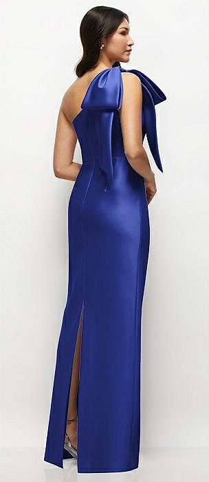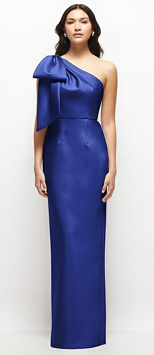 Bow One-Shoulder Satin Maxi Dress with Trumpet Skirt in cobalt blue