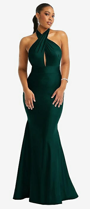 Criss Cross Halter Open-Back Stretch Satin Mermaid Dress in evergreen