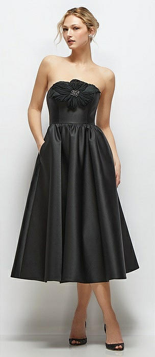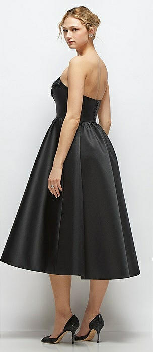 Strapless Satin Midi Dress with Handmade Flower & Horsehair Hem in black