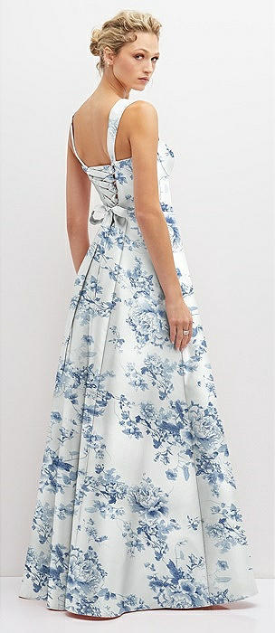 Floral Lace-Up Back Bustier Satin Dress with Full Skirt and Pockets in cottage rose larkspur