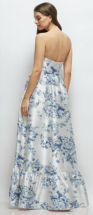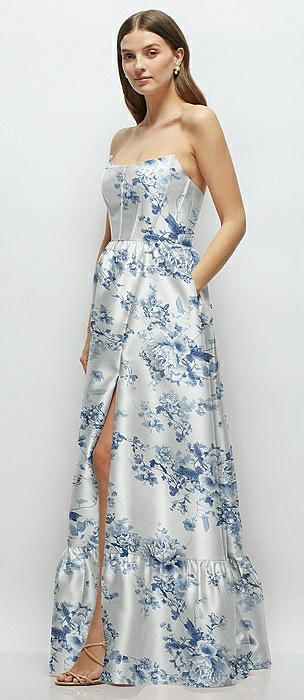 Floral Strapless Cat-Eye Boned Bodice Maxi Dress with Ruffle Hem in cottage rose larkspur