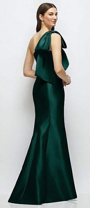 Bow One-Shoulder Satin Maxi Dress with Trumpet Skirt in evergreen