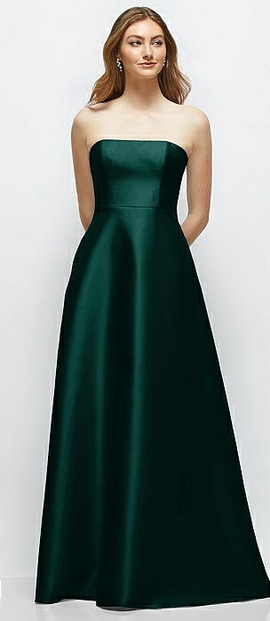 Strapless Satin Drop Waist Gown with Full Skirt in evergreen