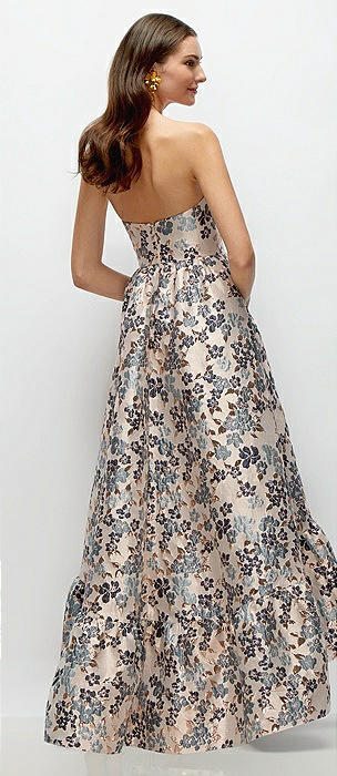 Strapless Cat-Eye Corset Gilt Indigo Brocade Floral High-Low Dress with Ruffle Hem