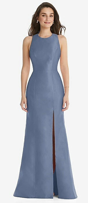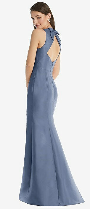 Jewel Neck Bowed Open-Back Trumpet Dress with Front Slit in larkspur blue