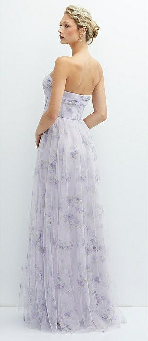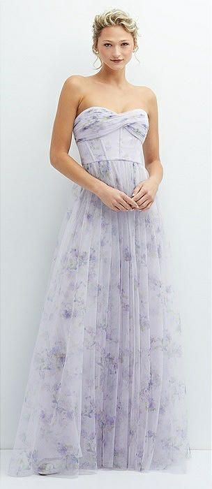 Floral Strapless Twist Cup Corset Tulle Dress with Long Full Skirt in lilac haze garden