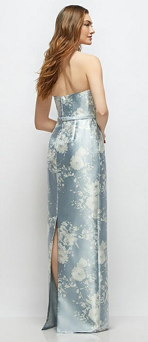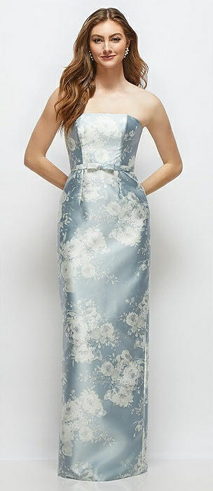Floral Strapless Satin Column Dress with Bow-Trimmed Skinny Belt in porcelain blue seraphina floral