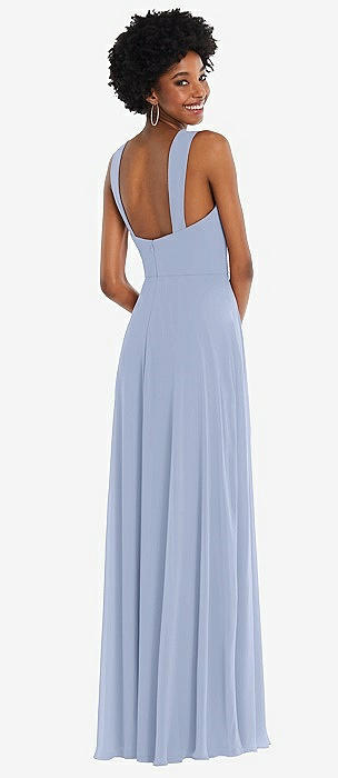 Shirred Skirt Jewel Neck Halter Dress with Front Slit in sky blue